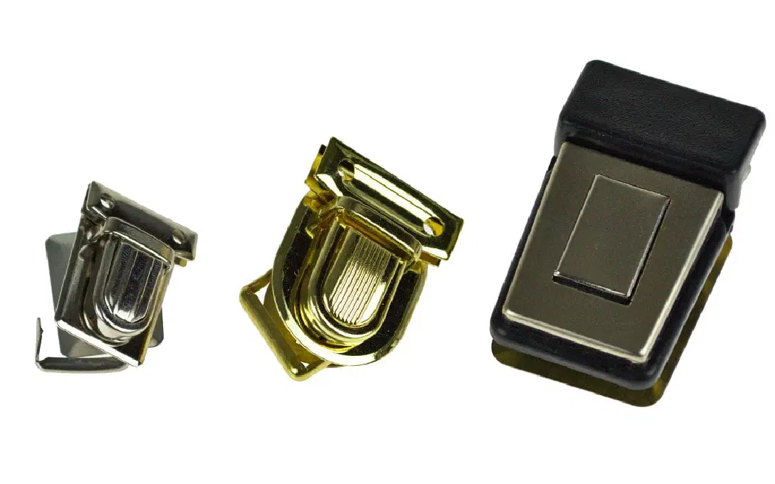 Zapínání na aktovky a brašny nabízíme v různých provedeních (zlato, stříbro, s černým plastem).